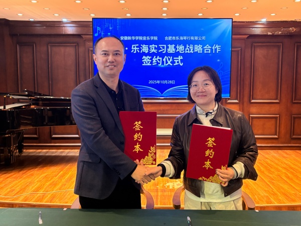 本网讯(通讯员:李尚锋)为深化产教融合,创新音乐人才培养模式,为学子搭建从课堂到岗位的实践桥梁,10月28日,音乐学院与合肥市乐海琴行有限公司隆重举行“新华・乐海实习基地”签约仪式。音乐学院执行院长彭智、教学秘书郑永玲等代表出席,乐海琴行总经理蒋剑接待并参与活动。此次合作标志着双方在校企协同育人领域开启新篇章。